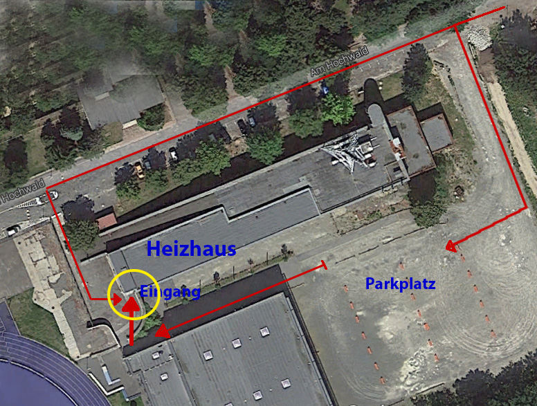 Vom Parkplatz am Fuß der großen Sporthalle aus gelangen Sie über die Treppe nach oben zum Eingang des Heizhauses.